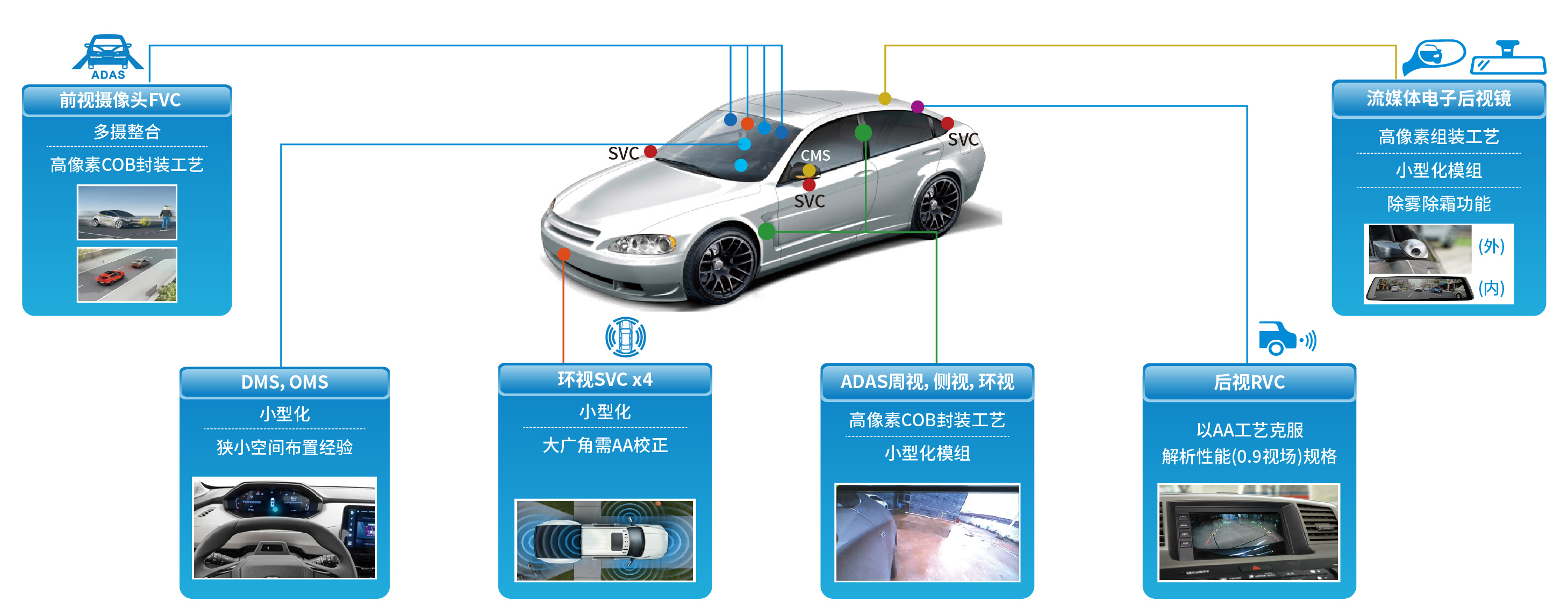 傳感器方面:公司為客戶提供全套攝像頭解決方案,包含:前視,側(cè)視,環(huán)視,電子外后視(CMS),駕駛員監(jiān)控(DMS),乘客監(jiān)控(OMS)等。產(chǎn)品覆蓋1M-8M,48M車頂云臺(tái)及12M、17M高像素產(chǎn)品即將量產(chǎn)。